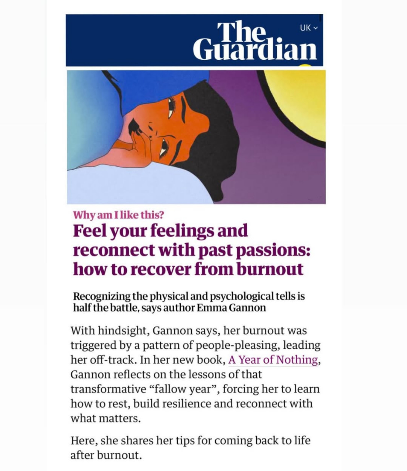 One of my favourite journalists is Elle Hunt. She has written great pieces ranging from thin-slicing your joy, to beating overwhelm, and building community. For the release of A Year of Nothing, I reached out to Elle and she interviewed me for her US Guardian column on all things wellbeing. We spoke about how to feel your feelings and reconnect with past passions: how to recover from burnout.